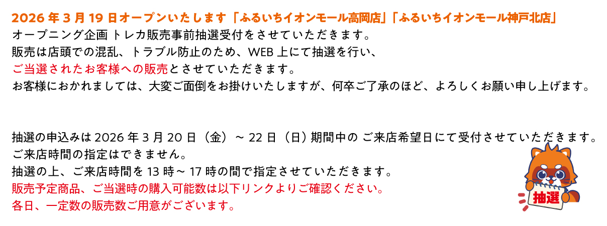 ふるいちイオンモール高岡店、ふるいちイオンモール神戸北店 オープニングセール トレカ販売事前抽選申込について